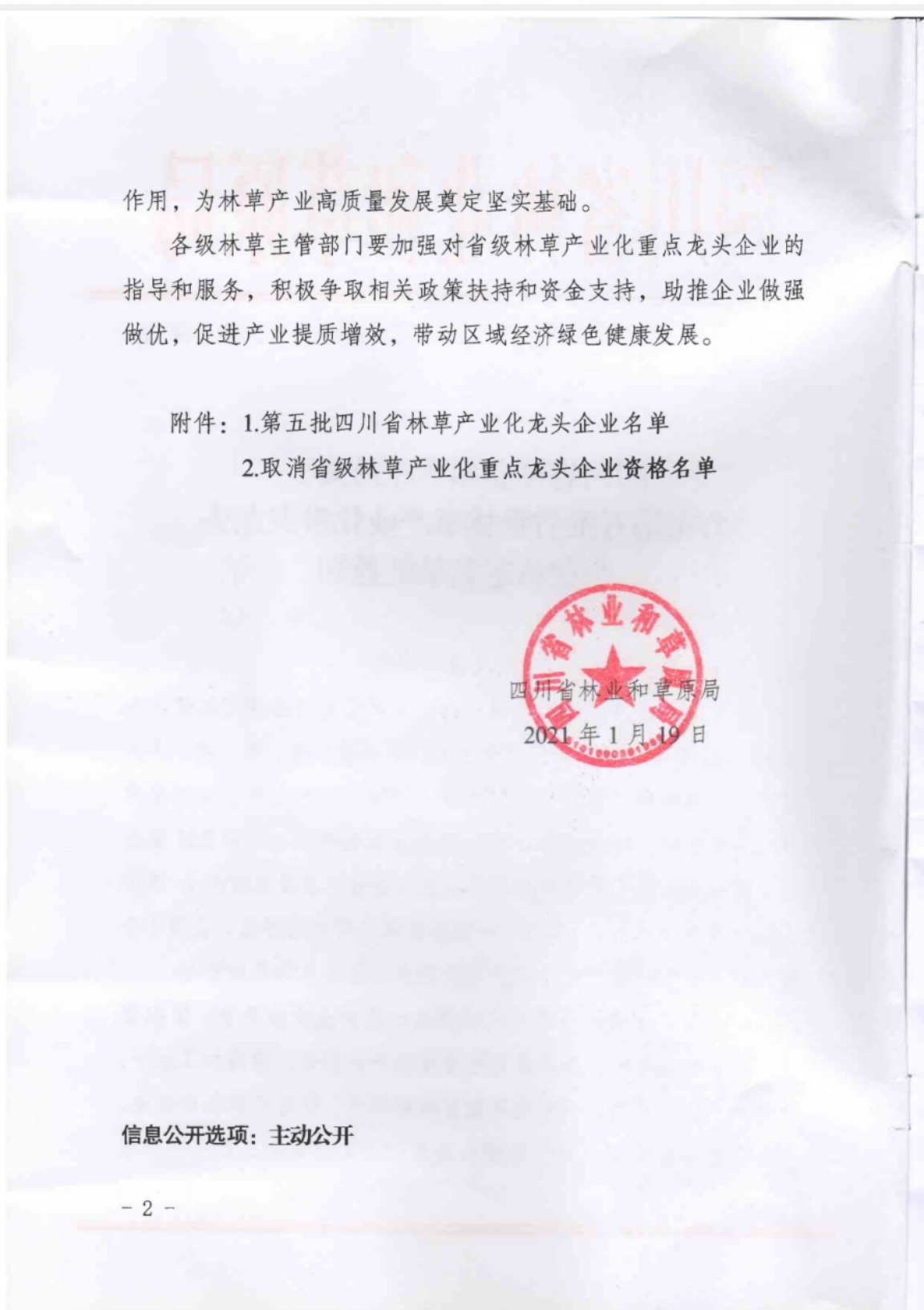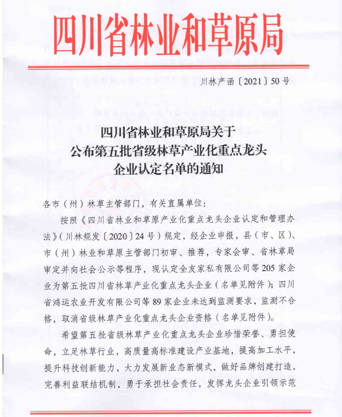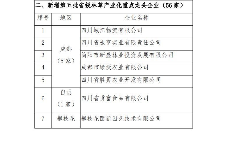 日前,四川省林業(yè)和草原局公示了關于認定第五批四川省林草產(chǎn)業(yè)化重點龍頭企業(yè)的名單。按照《四川省林業(yè)和草原產(chǎn)業(yè)化重點龍頭企業(yè)認定和管理辦法》規(guī)定,經(jīng)企業(yè)申報,縣(市、區(qū))、市(州)林草主管部門推薦,省林草局初審、專家會審等程序,全省共評選出205家省級林草龍頭企業(yè),包括149家監(jiān)測合格省級林草龍頭企業(yè)名單和四川岷江物流有限公司等56家擬新增省級林草產(chǎn)業(yè)化重點龍頭企業(yè)。