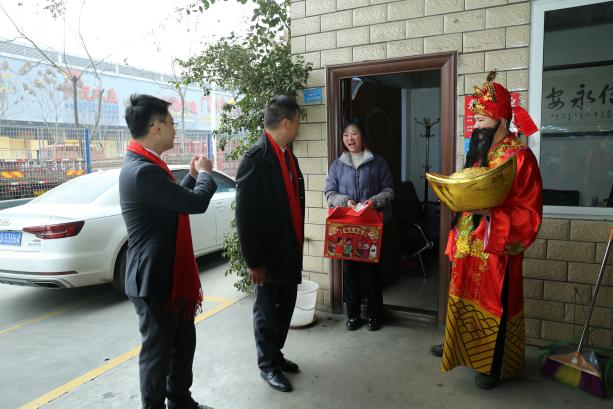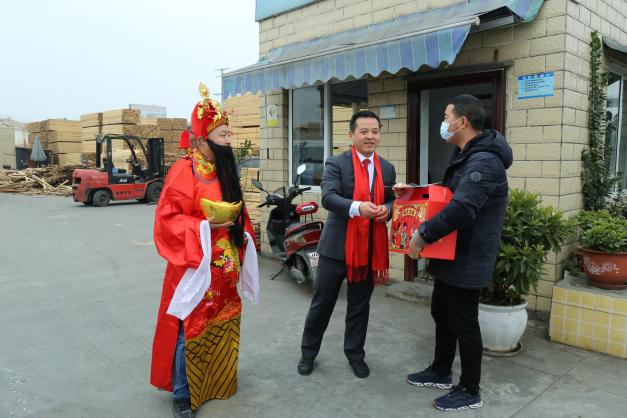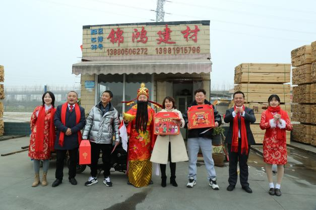 原來青白江國際木材交易中心為了感這一年來市場商家們的支持正在舉辦“財神送福迎新春——四川岷江物流有限公司新春慰問客戶活動”。只見“財神爺”身穿大紅袍,手持金元寶,頭戴發(fā)財帽冠,跟隨著中心領(lǐng)導(dǎo)班子一行將一箱箱滿滿的年貨和一封封情真意切的感謝信挨家挨戶地送到了商家們的手中,同時送上一句“新年快樂,恭喜發(fā)財!”喜慶的祝福充滿了濃濃的年味,沉甸甸的年貨承載著太多的情意,商家們高高興興地把這份心意領(lǐng)回家,現(xiàn)場一派歡樂熱鬧。