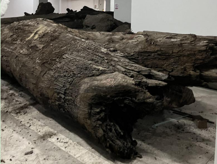 (1)陰沉木:長(zhǎng)11m;直徑(小頭)1.45,大頭2m;重約13.56噸;AMS14C年齡測(cè)定報(bào)告顯示為2554年;共1件。