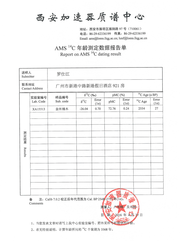 AMS14C年齡測(cè)定報(bào)告顯示為2554年;