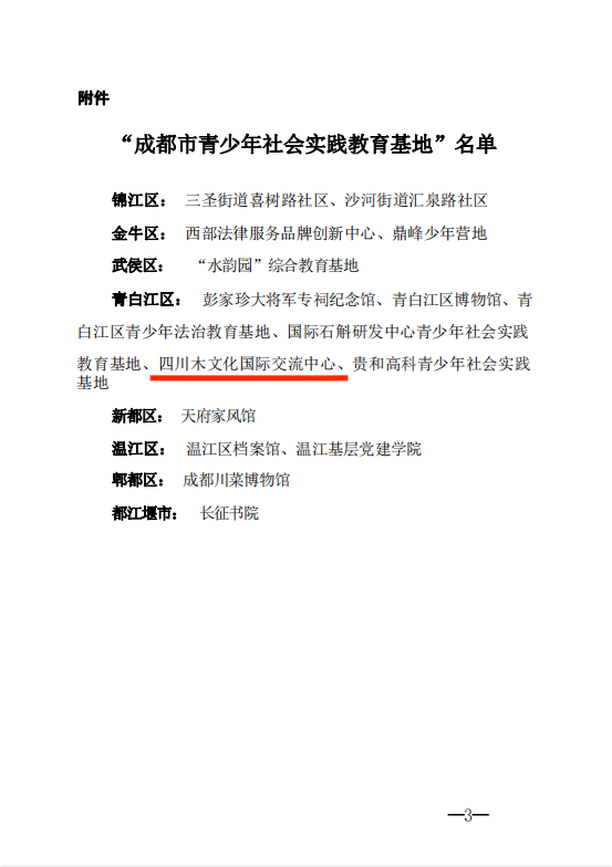 2022年10月26日,成都市關(guān)心下一代工作委員會(huì)發(fā)布了《關(guān)于命名“成都市青少年社會(huì)實(shí)踐教育基地”的通知》,四川木文化國(guó)際交流中心被命名為“成都市青少年社會(huì)實(shí)踐教育基地”。