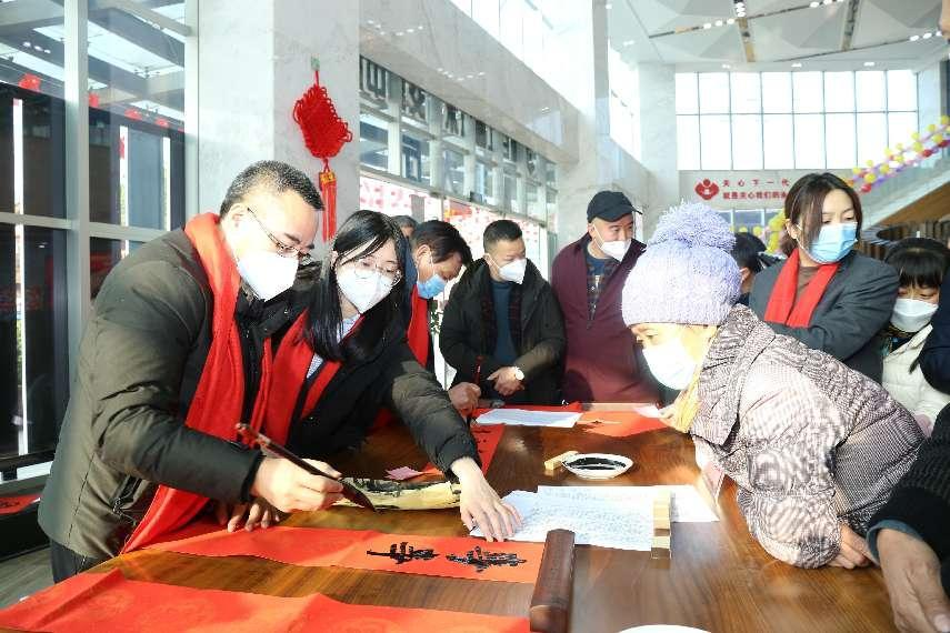 無聯(lián)不成春,有聯(lián)春意濃。過年張貼春聯(lián)、福字是中華民族迎接新春的傳統(tǒng)習(xí)俗、是優(yōu)秀傳統(tǒng)文化的一部分,寄托著人們對新一年的美好憧憬和向往。活動現(xiàn)場,一盞盞燈籠高高掛起,一張張桌子紅紙鋪滿,四位書法老師揮灑筆墨,筆鋒輾轉(zhuǎn),方寸之間,書寫出一幅幅吉祥如意的春聯(lián)??蛻襞笥褌円贿呅蕾p大師書法技藝,一邊品評春聯(lián)的寓意,當(dāng)接過心儀的春聯(lián)時每一個人都喜笑顏開、愛不釋手。