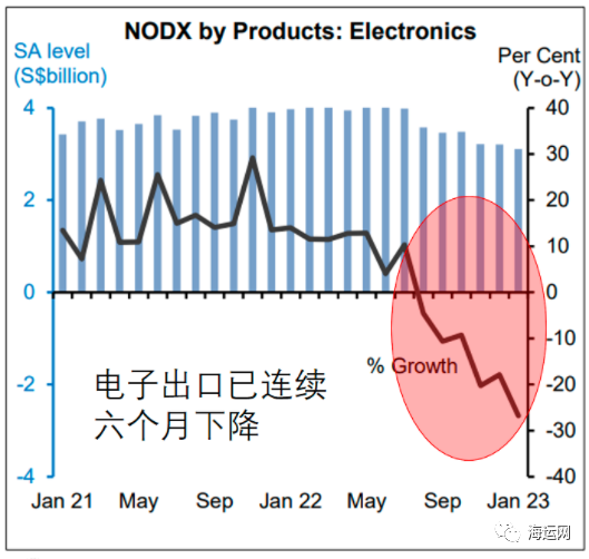 非石油國內(nèi)出口NODX當(dāng)中,電子類和非電子類雙雙萎縮。其中,電子業(yè)出口跌幅從去2022年12月17.9%擴(kuò)大至26.8%(已連續(xù)六個月萎縮);非電子業(yè)出口的年比跌幅從21.3%擴(kuò)大至24.5%。與此可看,新加坡跟香港一樣,外貿(mào)數(shù)據(jù)并不好看,全方位萎縮惡化。
