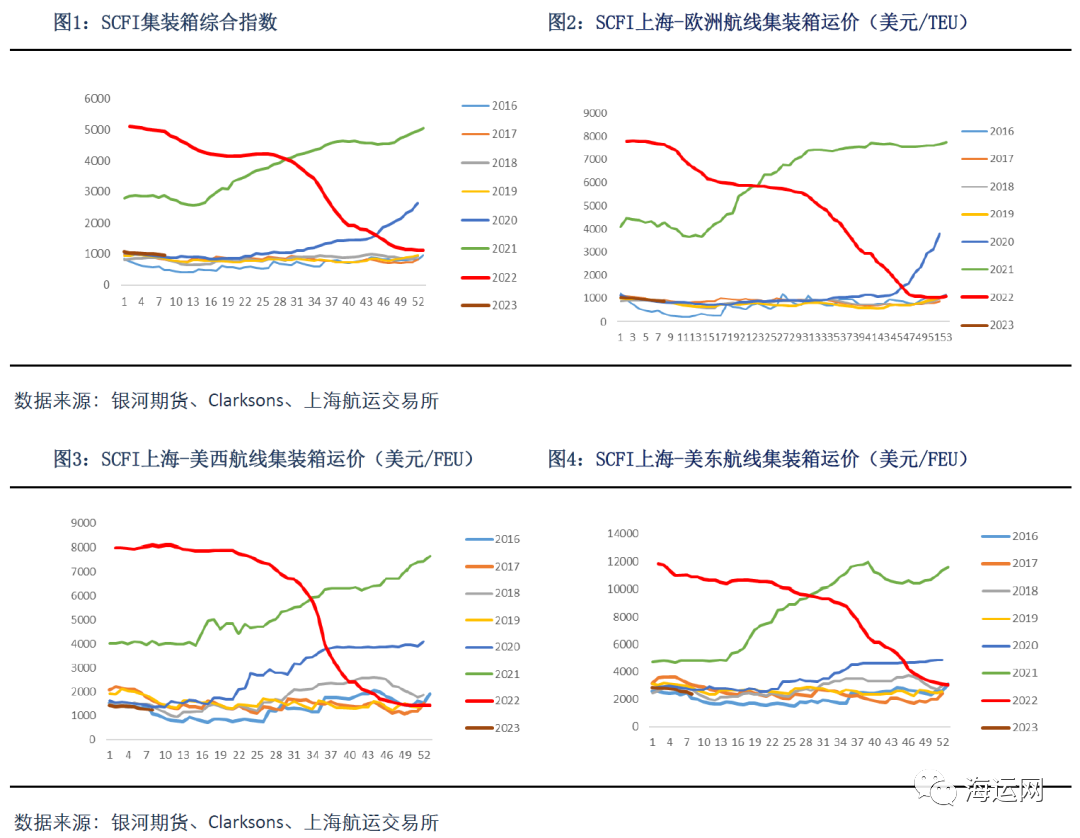 運價方面:2月集裝箱運價延續(xù)下跌,節(jié)后淡季集裝箱運輸市場供需格局繼續(xù)走弱。具體來看,截至2月24日當(dāng)周,上海出口集裝箱運價指數(shù)SCFI報946.68點,環(huán)比-2.9%,同比-80.4%。其中上海-美西線運價報1234美元/FEU,環(huán)比-3.1%,同比-84.7%;上海-歐洲航線運價報882美元/TEU,環(huán)比-3.1%,同比-88.3%。整體來看,春節(jié)過后集裝箱航運市場表現(xiàn)平淡,集裝箱運輸供需格局延續(xù)寬松。