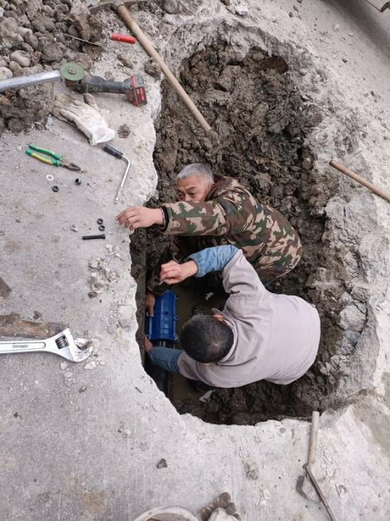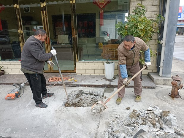 情況緊急,面對困難綜合服務(wù)部迅速行動,大家依據(jù)管道走向和流水方向深入分析研判,最終將漏點鎖定在B區(qū)8幢與9幢之間的主路上,即刻安排維修人員進行開孔作業(yè)。但該區(qū)域進行破土作業(yè)需要借助專業(yè)機械,可現(xiàn)在已臨近年關(guān),市場長期合作的挖掘機師傅已回老家過年。