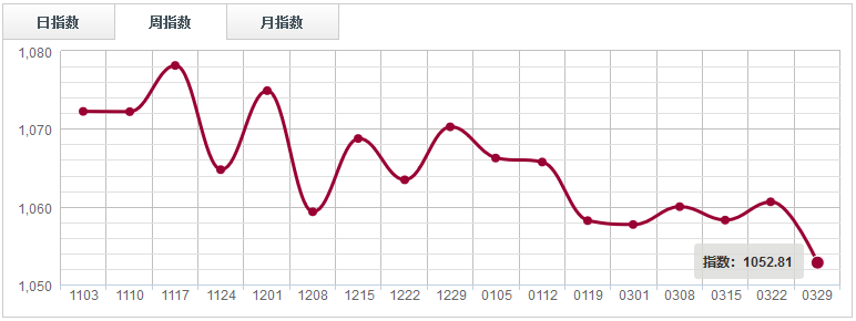 與前一周相比,本周原木市場有小幅調(diào)整的跡象,周指數(shù)報1052.81點,周環(huán)比跌7.81點,跌幅0.74%。周銷量環(huán)比下滑0.84%,交易額下滑6.38%。三大市場中,廣東魚珠市場和上海福人本周表現(xiàn)較為動蕩,周指數(shù)下跌1.68%、0.09%,交易額環(huán)比下跌2.21%、15.62%。四川大西南本周指數(shù)環(huán)比上漲0.81%,交易額增加18.44%,有效地抑制了大盤的下跌趨勢。
