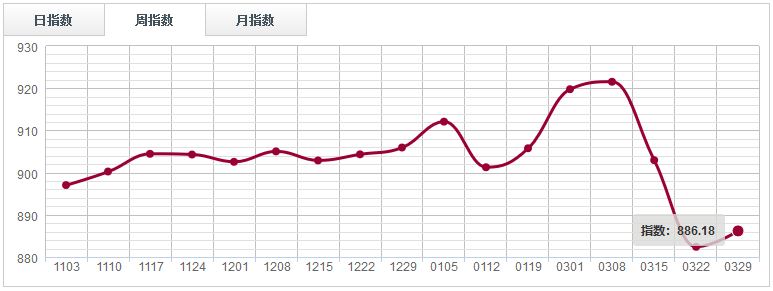 經(jīng)過兩周的低位盤整之后,本周人造板指數(shù)重回升勢,報收886.18點,環(huán)比上漲0.43%。其中魚珠人造板指數(shù)、福人人造板指數(shù)、大西南人造板指數(shù)分別下跌0.17%、0.1%、0.77%;臨沂人造板指數(shù)上漲1.02%。